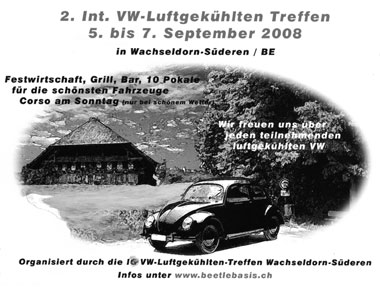 11 - 12 octobre 2008 La saison des meetings arrive à son terme, mais un nouveau projet a pris place dans le fond de votre garage. Une Cox, un Bus ou autre, du travail en perspective pour la période hivernale. Mais voilà, le puzzle n'est pas complet, il vous manque certaines pièces, alors si l' envie vous prend de passer une journée dans la plus grande bourse de pièces d'Europe (3’000 stands) à chasser de la pièce tout azimut, prenez contact avec Patrick Montoliu (par téléphone au 021/944.56.65 ou par e-mail à patrick.montoliu@bluewin.ch). |