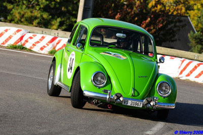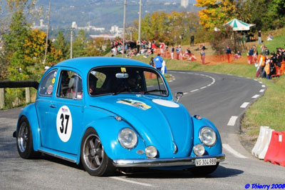 Revoici la Bleue et la Verte, parties pour de nouvelles aventures... Le 19 octobre dernier, nous sommes partis pour participer à la 3ème Montée historique de Montagnole en France. Un peu de géographie ne nous fera pas de mal, Montagnole se trouve dans le département de la Savoie, sur les hauteurs de Chambéry.![]() Arrivés à Montagnole, les choses sérieuses commencent, contrôle technique, présentation des papiers. C'est bon, les 2 Cox sont "OK". Puis, on se fait offrir par l'organisation une bière verte au génépi, qui illumine le visage de Michel! Après une bonne nuit de sommeil dans un BnB très cozy, nous nous réveillons sous un brouillard épais, on ce croirait presque à Yverdon! Nous voici au parc fermé. Que de superbes voitures, dont beaucoup de cousines de la VW comme un journaliste bien connu dans notre monde VW nous le disait. Donc R8 Gordini, Alpine A110, NSU TT etc. et bien sûr quelques petites soeurs Porsche. Nous voici au départ de la première manche, Christian Buffet a pris place à côté de Michel pour immortaliser le moment avec son camescop. C'est parti... la Verte est déjà loin dans un rugissement de moteur et de pneus, et voilà la Bleue devant une belle Porsche racing orange, glup faudra mettre les gaz, et la Bleue s'élance à son tour. Le tracé de 1,7 km est très sympa, des épingles, des tronçons plus rapides parsemés de chicanes, et la route est une belle surface plane! Belle montée, les deux Cox rejoignent le parc fermé. Petite spécialité de cette manifestation : pour aller du parc fermé au départ, il y a un petit parcours de 6 km de régularité; qu'est-ce que la régularité? A la sortie du parc fermé, ils donnent une moyenne à respecter jusqu'au départ de la spéciale, sur le parcours de régularité des postes de contrôle cachés chronomètrent notre passage. Le but est de par exemple tenir une moyenne de 40 km/h sur toute la longueur du parcours. Les points de pénalités sont de 250 points par minutes d'avance et 100 pts par minutes de retard . Voilà excusez-moi pour cette ennuyeuse explication technique, revenons à la course. Pour la deuxième manche, Christian prend place dans la Bleue. ![]() Pour la troisième manche, cerise sur le gâteau, l'assemblée entière a réussi à convaincre à grand peine Sandrine de venir avec moi... mais ça ne va pas se passer aussi bien... donc nous voici à nouveau "encolonnés" pour le départ, quelle chaleur sous ces casques, on se ventile avec les portières! Départ impeccable de la Verte. A mon tour , go... gaz à fond... 1ère... 2ème, Sandy s'accroche à la poignée... voilà la première chicane... gros freinage... et... horreur, ma porte s'ouvre et se referme violemment en percutant la botte de paille!!! Grrrrrrrosse rage! Bon, on continue la montée, on passe l'arrivée sans autre encombre, on rejoint le parc fermé... mais qu'est-ce-que je vois au bord de la route... la Verte avec le capot levé... Michel me raconte que cette troisième manche fut catastrophique... une vis de la tringlerie s'est fait la malle... du coup la Cox ne tournait plus du tout rond et les gaz restaient bloqués à l'entrée des épingles... pas bien!!! Heureusement la réparation fut vite faite et de mon coté la porte n'a même pas une égratignure, ouf!!! On peut se présenter à la 4e montée qui fut parfaite pour les deux compères. Et voilà c'est la fin, nous assistons à la remise des prix, où nous gagnons chacun une belle meuleuse d'angle. Quelle magnifique journée, que du bonheur, une superbe organisation, et fatigués mais heureux, nous reprenons la route direction la maison. Maintenant les Cox sont rangées, elles prennent un repos bien mérité, on se retrouvera l'année prochaine pour de nouvelles aventures. Tout au long du week-end nous étions accompagnés d'un fameux journaliste, bien connu dans notre monde VW... n'oubliez pas d'acheter votre prochain magazine technique préféré! Vous pourrez y voir un sujet sur ce week-end écrit par ce célèbre journaliste! Vous pouvez aussi voir de très belles photos de cette montée historique sur http://www.forum-auto.com/sport-auto/theme40/sujet378795.htm Daniel Cuche |