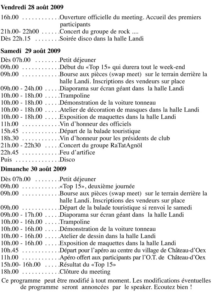 Dans à peu près un mois et demi, Château-d'Oex vivra une nouvelle fois au rythme du "quatre-à-plat" VW. Depuis plusieurs mois, le comité d'organisation ne ménage pas sa peine pour assurer la réussite de cette 16e édition du meeting int. VW à Château-d'Oex. En fait, il n'y a guère que la pluie qui puisse venir ternir la fête! Pour vous donner l'eau à la bouche, voici le programme complet de ce meeting, tel que présenté dans le livret de fête. |