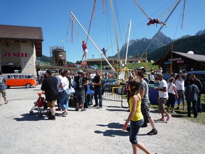 Voici une façon originale de prendre ses aises sans pour autant risquer de se faire remettre à l’ordre par les responsables du terrain! | La fête a été belle y compris pour les enfants ou... les grands enfants. L’installation de trampoline a tourné à plein régime! | Il y avait de l'ambiance dans la halle Landi, que ce soit le vendredi ou samedi soir! |