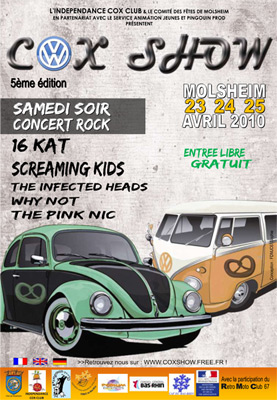 Après le faux départ engendré par la sortie à ski noyée sous les intempéries, la saison 2010 sera véritablement lancée avec le meeting alsacien de Molsheim les 24 et 25 avril prochain. Ayant été un fidèle participant des meetings Alsacox et Rohrwiller (malheureusement aujourd’hui disparus), le Lémania Coccinelle Club va retrouver l’Alsace avec beaucoup de plaisir. Le meeting de Molsheim, dont ce sera la 5e édition, a la particularité de se dérouler le dimanche à l’intérieur même de la ville. Au programme, animations pour adultes et enfants, balade à travers le vignoble alsacien avec dégustation de vin et présentation de danse folklorique, concert rock le samedi soir, course de caisse à savon le dimanche, etc. Pour plus de renseignements, vous pouvez vous rendre sur le site internet dédié à ce meeting (www.coxshow.free.fr). En raison de la date printanière, c’est l’option « hôtel » qui a été retenue pour la nuit de samedi à dimanche. Aussi, afin que l’on puisse effectuer les réservations sans tarder, nous vous prions de bien vouloir renvoyer le bulletin d’inscription ci-joint le plus tôt possible avec comme dernier délai le 22 mars prochain. Passé cette date, nous ne serons plus en mesure de vous garantir une chambre d’hôtel. Pour information, certains membres du club ont déjà réservé leur chambre à l’hôtel le Bugatti de Molsheim, ainsi qu’à celui de Diana, toujours à Molsheim, mais un peu plus près du meeting. Merci d’indiquer clairement sur le bulletin d’inscription ci-joint si vous voulez que le club s’occupe de votre réservation ou si vous préférez réserver votre logement vous-même. Naturellement, si vous préférez le camping (notamment les possesseurs de bus, le camping de Molsheim est ouvert (tél. 00 33 3 88 49 82 45). Ce camping est également équipé de mobilhomes (pour le camping et les mobilhomes, chacun effectuera individuellement sa réservation). Si vous choisissez l’option mobilhome, ne tarder pas à réserver. Au moment d’écrire ces lignes, il en restait encore 2 ou 3 de libres). Programme de la sortie Samedi 24 avril Dimanche 25 avril NB : Vous pouvez aussi participer à ce meeting uniquement le dimanche. Délai d’inscription : 22 mars 2010 |