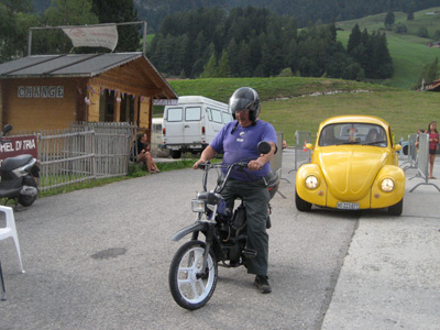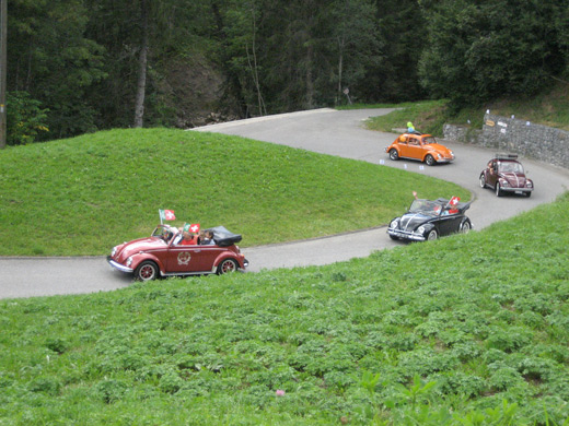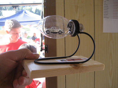 Nous avons également pu compter sur plus de 12’000 visiteurs! Sur l’image suivante, un autre point stratégique du meeting : la boutique. Les 3 actives “pipelettes” que sont Fabienne Vernier, Claudine Peter et Claudine Diserens nous ont présenté cette année encore une superbe boutique, aux articles variés et développent chaque année un peu plus le chiffre d’affaire de ce poste. On peut voir ensuite des images du swap-meet qui s’est déroulé à la sa-tisfaction générale des participants. Plusieurs rencontres traditionnelles ont lieu au cours du week-end. Jean-Luc rappelle notamment l’apéro avec les officiels qui nous permettent d’organiser notre rencontre dans de bonnes conditions. Il y a également l’apéro des présidents, la verrée offerte aux participants au centre du village... bref, plein de moments conviviaux qui permettent de se rencontrer et de maintenir les liens. Cette année, deux nouveaux membres du comité ont fait une entrée remarquée à des postes clés de l’organisation: Patricia Wenger pour la gestion des bénévoles et Stephan Grand pour la subsistance. Ils ont tous deux effectué leur travail avec beaucoup d’engagement, d’énergie et de sérieux. Ils en sont remerciés et félicités. Notre meeting ne pourrait pas avoir lieu sans ses sponsors. Jean-Luc, qui s’est évertué chaque année à les dénicher, nous indique qu’ils permettent d’équilibrer les comptes année après année. soir, l’absence du légendaire pont de danse a laissé plus d’un participant sur sa faim. Le comité en est cons-cient et essaie de trouver une solution avec l’aide des autorités de Château-d’Oex. Les véhicules primés dans le Top 15 étaient une nouvelle fois variés et splendides. Le cadeau offert aux lauréats était original puisqu’il s’agissait d’une WV dans une grande ampoule.