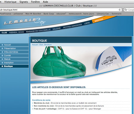 Ça y est, notre boutique est en ligne! Vous la trouverez en vous rendant sur notre site internet www.coccinelle.ch à la rubrique Club / boutique. Tous les articles disponibles ainsi que l’état du stock y sont détaillés. Vous trouverez également au début de la page toutes les conditions de vente ainsi que la marche à suivre pour commander un article. Au niveau des habits, notre fournisseur a rencontré énormément de problèmes dans l’approvisionnement de la marchandise. A tel point que ce n’est qu’à mi-juillet qu’il a pu ame-ner les différents articles chez le brodeur. On devrait enfin pouvoir les recevoir au début septembre… plus de 7 mois après notre commande! Alors que ceux qui avaient commandé une polaire ou une chemise en décembre dernier ou lors de notre dernière assemblée générale, se rassurent, ils vont bientôt recevoir leur commande. Pour la suite, si vous avez une idée d’un article qui pourrait venir compléter notre boutique, n’hésitez pas à en faire part à notre responsable de la boutique Fabienne Vernier. Elle saura prêter une oreille attentive à vos suggestions. |