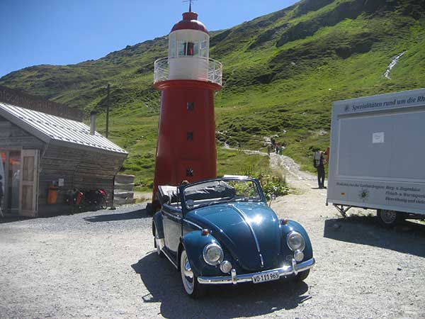 Voici une photo insolite qui réunit un phare, symbole de la mer et une VW Coccinelle, voiture particulièrement à l’aise en… montagne ! Mais où donc a bien pu être pris ce cliché qui n’est pas, je tiens à la préciser, un photo-montage. a) En Bretagne b) Au bord de la Méditerranée c) Au sommet du col de l'Alpe d'Huez d) Au sommet du col de l'Oberalp |