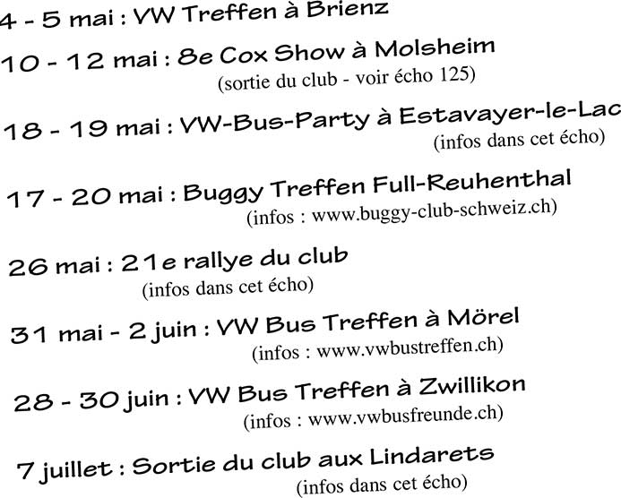 Morat 2014, c'est parti !Suite à la proposition faite par Patrick Montoliu en février 2012 d'organiser un meeting réservé exclusivement aux anciennes VW, un comité formé de 7 personnes et emmené par Patrick Montoliu a planché sans relâche pour mettre sur pied un meeting VW réservé exclusivement aux anciennes VW à l'instar de ce qui ce fait en Allemagne à Hessisch-Oldendorf ou Bad-Camberg. Le travail a porté ses fruits, puisque le Lémania Coccinelle Club était fier d'annoncer et de présenter officiellement ce nouveau meeting à l'Oldtimer & Teile Markt de Fribourg les 23 et 24 mars dernier. Un site spécifique est consacré à ce 1er meeting VW-Vintage organisé à Morat. |