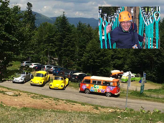 Michel Susin, l’animateur attitré de notre meeting int. VW à Château-d’Oex a ouvert l’an dernier avec deux associés un Parc Aventure dans la station de ski de Schnepfenried, située dans la vallée de Munster en Alsace. Pour fêter le 1er anniversaire de ce Parc Aventure, Michel a organisé un meeting de VW air-cooled. Invité, le Lémania Coccinelle Club n’a pas manqué l’occasion d’inscrire ce 1er meeting VW air-cooled, le plus haut de France, dans son calendrier, ce d’autant plus que l’Alsace a toujours attiré les membres du club. Malheureusement et d’une manière tout à fait inattendue, seules 3 voitures se sont inscrites à cette sortie. Et comme l’une d’entre elles a déclaré forfait au dernier moment suite à un problème technique, seules 2 voitures ont fait le déplacement en Alsace. Dommage, car nous avons passé un week-end magnifique ! Sur place, nous avons pu découvrir gratuitement le parc accrobranche constitué de 6 parcours différents à plus de 10 m. du sol. Si les 5 premières voies de difficulté progressive ne nous ont pas posé trop de pro-blèmes, par contre la 6e, la noire, nous a donné beaucoup… beaucoup de fil à retordre, au point que nous avons atteint l’arrivée avec un gros ouf de soulagement, mais aussi avec la satisfaction de l’avoir fait ! Ce parc aventure est vraiment ma-gnifique. Michel Susin et toute son équipe ont effectué un travail fantastique avec, comme récompense après une année d’exploitation, une fréquentation au-dessus des prévisions. Sur l’ensemble du week-end, un peu plus de 50 VW ont fait le déplacement, ce qui a comblé de joie Michel Susin qui avait, comme objectif, de passer le cap des 50 voitures. L’année prochaine, ce meeting VW sera reconduit. Naturellement, nous serons à nouveau de la partie avec, je l’espère, une plus forte participation du club. J’aurai beaucoup de plaisir à vous faire découvrir ce parc accrobranche et notamment la piste noire !