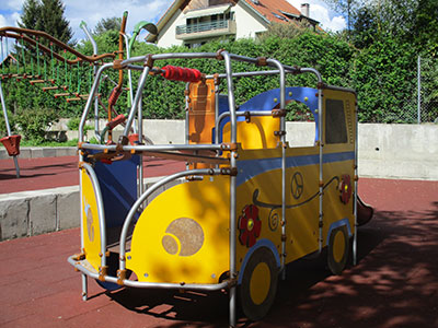 A Oron-la-Ville, l’étape se tenait devant le collège jouxtant une petite place de jeu accueillant un magnifique bus split. Bien vu! |