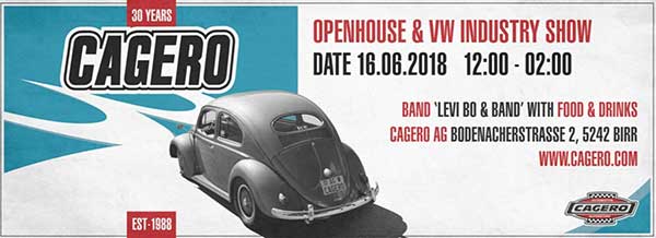 Cagero, le plus grand magasin de pièces détachées liées à nos chères Coccinelle et dérivés de Suisse, célèbrera le 16 juin prochain ses 30 ans d’activité. Programme de la journée 12h00 : 1er rendez-vous au restoroute de la Gruyère juste après Bulle 13h00 : 2e rendez-vous au restoroute de Grauholz, juste après Berne. Puis : participation aux 30 ans de Cagero. Retour à votre convenance. Inscription jusqu’au 7 juin prochain au moyen du bulletin d’inscription ci-joint ou directement en ligne via notre site internet – zone membres. |