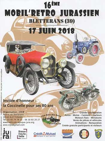 En 2018, VW fête les 80 ans de son 1er bestseller, la VW Coccinelle. Un jubilé que les organisateurs du Mobil’Retro jurassien, le plus grand rassemblement de véhicules anciens du Jura, ont décidé de fêter en désignant la VW Coccinelle invitée d’honneur à leur 16e édition qui aura lieu le dimanche 17 juin prochain à Bletterens, tout près de Lons-le Saunier. Du coup, la destination de notre sortie d’été coulait de source, d’autant plus qu’une membre de notre club habite la région ! L’occasion d’admirer un grand nombre de voitures de l’après-guerre ajoutée à la beauté du Jura français (env. 165 km de Vevey) constitue, à n’en pas douter, un programme des plus alléchants pour notre sortie d’été à laquelle nous espérons que vous serez très nombreux à participer. Programme de la journée 08h15 : rendez-vous au restoroute de la Côte près de Rolle 08h30 : départ en direction de Bletterens, via St-Cergues 11h00 env. : arrivée à Bletterens Puis : participation au 16e Mobil’ Retro Jurassin 16h00 env. : retour via Pontarlier Repas de midi : pique nique ou possibilité d’acheter sur place le menu (apéritif, - taboulé, poulet roti, gratin dauphinois, fromage, dessert, café) au prix de 16€ Sur place, un petit apéro sera offert par le club. Inscription jusqu’au 7 juin prochain au moyen du bulletin d’inscription ci-joint ou directement en ligne sur notre site internet via la zone membres |