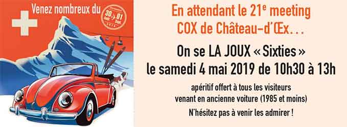 Placé sous le thème ”Bienvenue en Suisse”, les préparatifs du 21e meeting int. VW à Château-d’Oex avancent gentiment mais sûrement. Recherche d'annonces pour le livret de fêteVous avez reçu dernièrement un courrier concernant la recherche d’une annonce pour le livret de fête. Quelques membres nous ont déjà retourné le contrat joint à ce courrier. Merci beaucoup. Cependant, nous espérons vivement que d’autres membres leur emboîteront le pas, le livret de fête occupant une part toujours plus importante dans le budget de la manifestation. Recherche des bénévolesVous allez recevoir très prochainement le courrier contenant le bulletin d’inscription comme bénévole. |