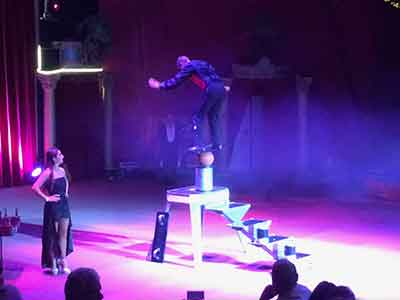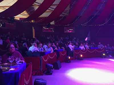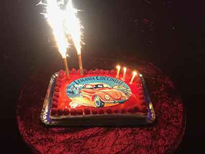 Ensuite de quoi, le spectacle – souper débuta par la présentation des artistes et du menu. L’excellent repas servi avec beaucoup de dextérité par les artistes (impressionnant) et le spectacle de haut niveau ont ravi toute l’assemblée. Juste avant le dessert agrémenté d’un superbe gâteau d’anniversaire décoré au logo du club, Fred Python, notre fournisseur des t-shirts à Château-d’Oex depuis la 2e édition en 1992 a tenu a offrir à Olivier un superbe cadeau en guise de remerciement pour sa fidélité : un tableau incroyable représentant, de jour, ses voitures avec en arrière-plan le paysage de Château-d’Oex et de nuit son portrait jouxtant celui de Ferdinand Porsche. Magique. Un procédé d’impression que Fred a mis patiemment au point durant de longues années. Si vous avez envie de vous faire plaisir, n’hésitez pas à le contacter !