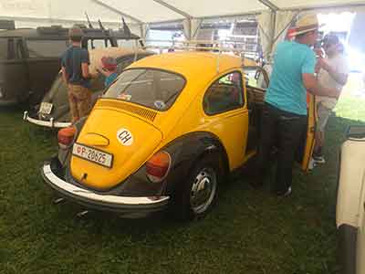 ”Félicitations à tous, une très belle organisation et un meeting parfait! Michèle; Super meeting et super équipe, au Top. 1ère fois et super content, à refaire, Gilles; Great week-end, thank you from Thomas et Annette, Denmark”. Comme le prouve ces messages incrits dans le livre d’or, la 21e édition de notre meeting int. VW à Château-d’Oex a à nouveau connu un immense succès populaire. Avec 1’184 voitures enregistrées officiellement, le Pays-d’Enahaut a une fois de plus fait le plein de VW ”air-cooled” ! Cette année, le CO a eu l’excellente idée de tenir une statistique consacrée aux modèles VW présents sur le meeting. Comme on pouvait s’y attendre, le bus VW s’est taillée la part du lion avec plus 500 unités présentes (~ 120 T1, ~ 230 T2 et ~ 175 T3). Juste derrière, on retrouve la VW Coccinelle (~ 420 berlines et ~ 75 cabriolets). Le solde des voitures présentes se répartissent entre les VW Karmann-Ghia (~ 50 modèles, typ 14 et typ 34 confondus), Type 3 (~ 20), Type 4 (~ 5), buggys (~ 20) , 181, Fridolin et autres carrosseries spéciales (~ 25). Il est à relever que cette statistique n’est pas complète, car une bonne cinquantaine de personnes ne sont pas venues chercher leur cornet d’entrée et n’ont de ce fait pas donné le type de voiture avec laquelle ils ont participé au meeting ! En adéquation avec le thème ”Bienvenue en Suisse” , une tente abritant une dizaine de VW spécifiques ”made in Switzerland” a été dressée à l’entrée du terrain 2. Cette remarquable exposition de modèles rares, voire uniques, était complétée par une 2e exposition à l’intérieur de la halle Landi qui, outre la présentation des VW construites en Suisse ou qui ont marqué le paysage helvétique dans les années 50 et 60, faisait également la part belle au Lémania Coccinelle Club, au bus VW T3, à la VW-Porsche 914 ainsi qu’au cabriolet VW Coccinelle qui fêtaient respectivement cette année leur 30e, 40e, 50e et 70e anniversaire. La salle du Zénith, abritait, quant à elle, une magnifique exposition d’anciennes publicité VW. Samedi après-midi, plus de 100 voitures ont participé à la traditionnelle balade empruntant la route du Revers pour rejoindre Rougemont avant de retourner sur la place de fête par les Sciernes-Piccats ; un parcours fantastique offrant un panorama de toute beauté, baigné par un soleil éclatant ! Rebaptisé ”Le Terrier des Marmottes”, le coin réservé aux jeunes enfants a également connu un immense succès. La scène ”plein air” ainsi que les 2 traditionnelles soirées disco ont permis à tous les participants de… faire la fête. Comme lors des éditions précédentes, il y avait de l’ambiance à Château-d’Oex. Pour le traditionnel apéro du dimanche matin offert aux participants du meeting, Pays d’Enhaut Tourisme a eu l’excellente idée de le déplacer de quelque centaines de mètres (du centre du village aux abords du restaurant le Chalet) afin d’offrir aux participants une vue magnifique sur les montagnes environnantes. Une initiative appréciée à sa juste valeur par beaucoup de participants. Même si le soleil s’est montré beaucoup plus discret le dimanche, la météo a heureusement tenu bon jusqu’à 17h. avant que la pluie ne vienne inonder le pays d’Enhaut. Cependant, si le meeting a connu un énorme succès côté jardin, le bilan est beaucoup plus contrasté côté court. La faute à plusieurs facteurs. Tout d’abord, la principale déception est venue des membres du club qui n’ont pas vraiment joué le jeu. En effet, en dehors du comité élargi, une trentaine de membres seulement se sont engagés comme bénévoles ; cela représente à peine le 25% des bénévoles inscrits pour ce 21e meeting int. VW à Château-d’Oex. Une situation difficile qui n’a pas rendu facile la gestion du meeting. Heureusement que le CO a pu compter, en dehors du club, sur des bénévoles aussi enthousiastes que fidèles. Deuxièmement, le bilan financier est négatif. Même si la météo a été dans l’ensemble favorable, il faut savoir que c’est le dimanche que l’on accueille le plus de spectateurs. Et comme le dimanche n’a pas bénéficié du même soleil que le samedi (s’il n’a pas plus à Château-d’Oex avant la fin du meeting, il n’en a pas été de même dans le reste du canton), les recettes n’ont de loin pas atteint les montants enregistrés en 2015 et 2017. De plus, mettre sur pied une telle manifestation coûte de plus en plus cher. A titre d’exemple, le canton oblige tout organisateur à mettre sur pied un service médical à la hauteur de l’événement, faisant ainsi passer la facture des samaritains de 800 francs à… 4'800 francs ! Enfin, les éventuels sponsors sont de plus en plus difficiles à convaincre, ce d’autant plus que notre manifestation qui rassemble des voitures, synonyme de pollution, n’est plus tellement porteuse ! Il appartient maintenant au comité de mettre tout en œuvre pour assurer la pérennité de cette manifestation, qui fait partie du top ten des meetings VW européens. Retour en images sur cette 21e édition qui restera quoi qu’il en soit, comme très réussie. Olivier
