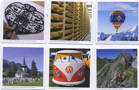 Pratiquant la gymnastique depuis mon plus jeune âge, j’ai participé à Château-d’Oex le 27 novembre dernier à un entraînement en vue de la prochaine Gymnaestrada (rencontre internationale de gymnastique rassemblant, tous les 4 ans, plus de 20'000 gymnastes du monde entier) qui se déroulera cet été à Amsterdam. A cette occasion tous les gymnastes participant à cet entraînement ont reçu de la part de l’Office du Tourisme du Pays-d’Enhaut un petit sac en toile contenant des brochures présentant le Pays-d’Enhaut ainsi que quelques cadeaux. Parmi ceux-ci, figurait un jeu Memory contenant de magnifiques images représentant le Pays-d’Enhaut et tout ce qui s’y passe. 6 des 24 images composant le jeu du Mémory édité par l’Office du Tourisme |