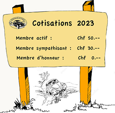 Bonne nouvelle, pour 2023 le montant des cotisations reste inchangé (voir tableau ci-après). 1. Effectuer un virement bancaire en se basant sur les données bancaires de la page 3 de cet écho et non sur celles figurant sur la facture avec QR code 2. Payer votre cotisation en espèce lors d’une sortie du club 3. Envoyer le montant de votre cotisation dans une enveloppe à l’adresse du club (Lémania Coccinelle Club, case postale, 1800 Vevey).
