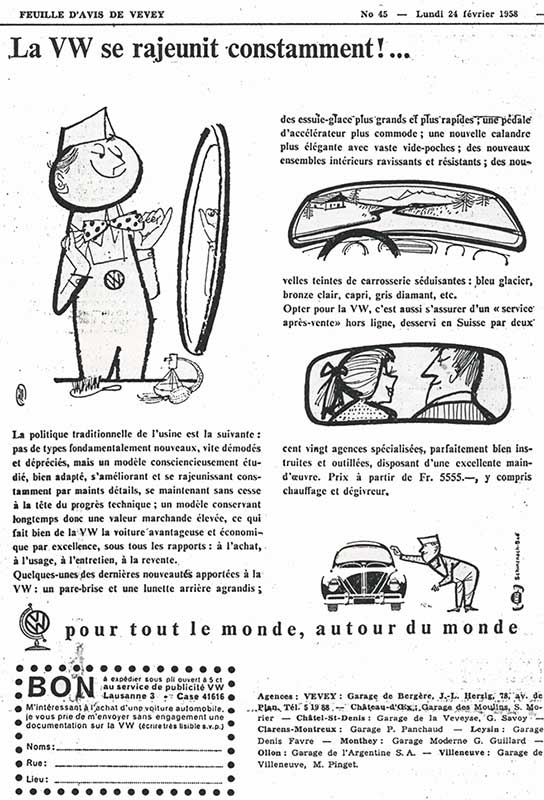 A partir de cet écho n° 17, nous allons publier régulièrement des articles ayant trait au passé de la VW Coccinelle. Voici donc, pour le plaisir des nostalgiques, une publicité parue le 24 février 1958 dans la feuille d’avis de Vevey. |