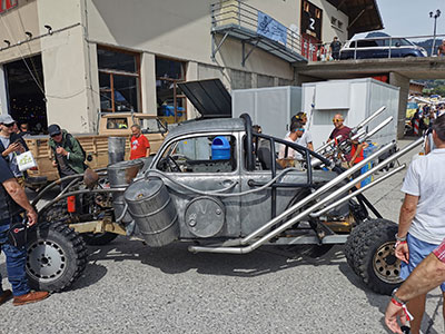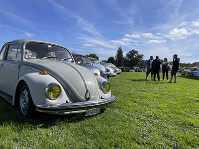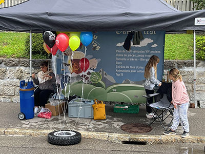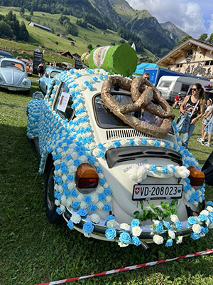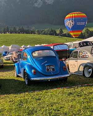Château-d’Oex, capitale des ballons et... des VW air-cooled. | Notre membre Marielle Morier a reçu le prix de l’originalité pour sa voiture décorée dans le thème du meeting ! | Cette année, notre exposition présentée dans la halle Landi comportait pas moins de 38 planches : 12 consacrées aux 75 ans du bus VW, 8 aux 70 ans de la VW Karman-Ghia type 14, 4 au Fridolin, 4 au Lémania Coccinelle Club, 8 intitulées « dans le rétroviseur » retraçant les événements importants qui ont marqué l’histoire de Volkswagen en comparaison avec ce qui s’est passé dans le monde pour les années 1935, 1945, 1955, 1965, 1975, 1985, 1995 et 2005 et enfin 2 en hommage à Michel Susin, la voix du meeting de 1992 à 2019, qui est malheureusement décédé le 8 décembre 2023. |