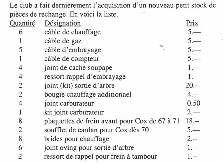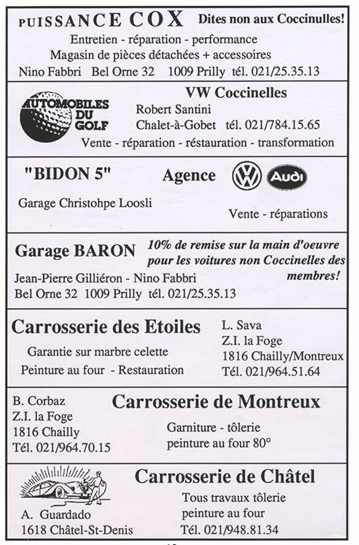 Qui n'a pas rêvé, un jour, avec un brin de perfectionnisme, mais surtout une bonne dose de courage, de restaurer sa Cox, seul et sans aide extérieure ! Cette bonne résolution -le sauvetage de nos bien-aimées, c'est l’assurance d'une longue et saine "amitié"- comporte quelques risques qui peuvent être de conséquence. Pour preuve, l’histoire de ce jeune homme qui, ayant acheté sa première VW, se décida pour une restauration complète. Après quelques coups de "clé de 13", la voiture s'avéra en très mauvais état et... bonne pour la casse. Notre jeune homme, pas dépité pour "quat' sous" et un tantinet têtu, repart à la recherche d'un nouvel insecte. L'objet de ses rêves est bientôt découvert et peu de temps lui en faudra pour se retrouver toute nue (inutile de rougir, madame Coccinelle !). Au premier coup d'oeil, la VW paraît saine, et un sablage en bonne et due forme est décidé. Mais voila, autres surprises de taille, la voiture avait été mastiquée du sol au plafond et gravement accidentée. Bien sur que cette voiture est restaurable, mais a quel prix ! Donc, redépart... à la casse et en plus, la crousille sonne dangereusement creux ! Moralité : a quoi ça sert que le club se "décarcasse" ? En effet, au sein du club, il existe des gens dynamiques et connaisseurs qui peuvent vous renseigner, vous conseiller et vous éviter de perdre du temps et de l'argent. A la fin de cet écho, vous trouverez la liste de nos membres qui travaillent dans le domaine de 1'automobile. De plus, en cas de problème ou si vous avez besoin d'un renseignement, n’hésitez pas a téléphoner à notre président Olivier Guignard qui vous aiguillera bien volontiers vers la bonne personne. Alors a bon entendeur !