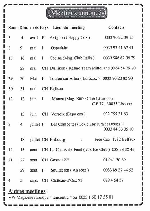 II y a l'ouverture de la pêche, l'ouverture de la chasse, et l’ouverture des meetings. Notre journal se fera un plaisir de vous annoncer les dates des rencontres des que nous en aurons connaissance à chaque parution. Si un week-end vous décidez de sortir votre VW pour une promenade de santé et que vous ne savez pas ou aller, appeler le tel. 029 4 54 37 et nous vous indiquerons où vous pourrez éventuellement vous rendre. Nous savons de dernière minute qu'une caravane sera organisée pour aller au Super VW National au Mans et que deux autres se déplaceront pour participer d'une part à une rencontre organisée par un club du Jura Français aux Combettes (souvenirs chers à certains...) et d'autre part au rallye de Soultzeren organisé par Alsacox en... Alsace, une semaine avant notre meeting de Château-d'Oex . Alors n'oubliez pas : le 029 4 54 37 vous renseignera sur ce qui se fait de mieux pour passer le week-end de votre choix au milieu de Volkswagen. |