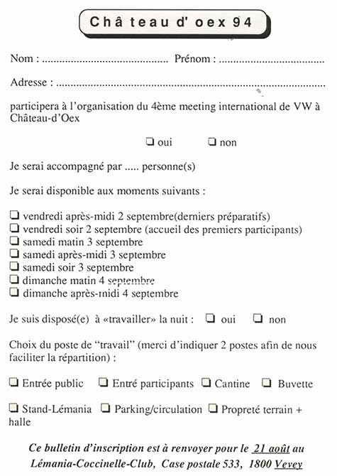 Le compte à rebours a commencé ! A un peu plus d’un mois du jour J, les derniers préparatifs vont bon train. Tout est pratiquement en place pour que la fête soit belle. Le programme définitif est maintenant sous presse. Comme l’an dernier, les participants n’auront pas le temps de s’ennuyer. Avec plus de 1500 VW attendues et quelques milliers de spectateurs, il y aura du monde les 2, 3 et 4 septembre prochain à Château-d’Oex. Pour accueillir toute cette foule, nous devrons pouvoir compter sur une armada de bénévoles. Et c’est là notre dernier souci (en dehors de la météo !), car vous n’êtes pas très nombreux à nous avoir retourné le formulaire d’inscription accompagnant le dernier “écho”. Alors si vous vous n’êtes pas encore inscrits et que finalement vous êtes libres ce week-end, n’hésitez à venir nous apporter votre aide, ne serait-ce que l’espace d’une demi-journée. On a besoin de vous. La réussite de notre manifestation dépend dans une large mesure de votre collaboration ! Pour plus de renseignements, vous pouvez prendre contact avec Martial Obéron, président du CO (tél. 029/4 .54.37) ou avec Oliver Guignard, président du club (tél. 021/943.44.38). Après cette date, nous établirons le planning définitif afin que chaque membre inscrit reçoive son horaire avant la fin août. |