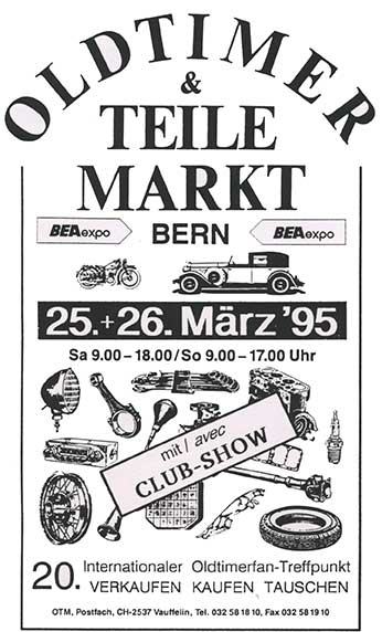 Nous profitons de cet écho pour vous rappeler que l’Oldtimer & Teile Markt de Berne aura lieu les 25 et 26 mars prochains. Dans le cadre de cette importante foire aux pièces (la plus importante de Suisse), notre club tiendra un stand. Le comité n’a pas ménagé sa peine pour monter un stand original et attrayant. Alors, si votre agenda est vide ce week-end, pourquoi ne pas profiter pour venir nous dire un petit bonjour. Cela nous fera très plaisir.