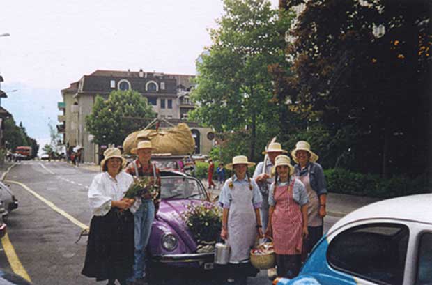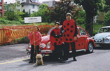 Invité à participer au cortège du 49ème giron des musiques de la Veveyse qui a eu lieu le dimanche 21 mai dernier, le Lémania-Coccinelle-Club a, une fois de plus, fait bonne figure. En effet, ce ne sont pas moins de 15 véhicules qui ont participé à cette manifestation. Citons-en quelques-unes : - la VW cadeau, enveloppée dans un gros noeud rose - l’irremplaçable “53” de Walt Disney - la Coccinelle “hiver”, recouverte d’une fine couche de neige immaculée - le cabriolet “ballon” dont les occupants semblaient tout droit sortis d’une bande dessinée pour enfants - la Coccinelle “agricole”, conduite de main de maître par une sympathique paysanne et entourée d’hommes et de femmes, déguisés style petite maison dans la prairie! Sans oublier divers véhicules sur lesquels étaient fixés une multitude de bouquets de fleurs. Le cortège s’est ébranlé dans les rues de la Tour-de-Peilz pour le plus grand plaisir des spectateurs qui ont sûrement dû autant apprécier la musique des fanfares que celle de nos refroidissements à air. Par la suite, une collation fut offerte à chacun.