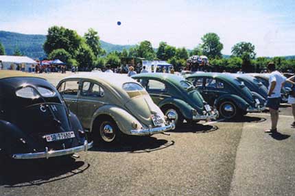 Cette année, Amag-Import AG fête ses 50 ans d’importation VW en Suisse. Pour marquer cet événement, un grand meeting VW “air cooled only” s’est déroulé à son centre de livraison de Birrfeld, non loin de son siège social de Schinznach-Bad. Organisé conjointement par Amag, représenté par Dino Graf et le Limmattal club de Zürich, celui-ci a rassemblé, les 19, 20 et 21 juin dernier plus de 700 voitures. C’est un peu moins qu’espéré (les clubs étrangers étant moins nombreux que prévu), mais cela représente néanmoins une des plus grandes affluences de l’année. Une belle récompense pour les organisateurs qui n’ont pas ménagé leur peine pour recevoir leurs hôtes dans les meilleures conditions possibles. Avec un soleil omniprésent tout au long des 3 jours, ce meeting a connu un magnifique succès. Et cerise sur le gâteau, le nombre de VW anciennes a été tout simplement impressionnant. C’est à coup sûr le meeting où j’ai le plus vu de splits et d’ovales, toutes plus belles les unes que les autres, rassemblées à un même endroit. A noter également une belle brochette de VW à carrosseries spéciales, telle la Enzmann 506. Le hasard faisant bien les choses, les 50 ans d’importation VW en Suisse coïncident avec le lancement officiel de la... New Beetle. Bien que celle-ci ne soit disponible en Europe qu’à la fin de l’année (si tout va bien), la New Beetle était bien présente à Birrfeld. Et plutôt deux fois qu’une puisqu’Amag en présentait deux : un premier modèle noir placé sur un podium à côté d’une split de couleur identique et un 2e exemplaire, bleu, exposé dans une grande tente regroupant de magnifiques VW provenant du musée VW de Wolfsburg et de collections privées. A noter que cette New Beetle, était exposée portes ouvertes et que l’on pouvait donc l’examiner sous toutes ses coutures et même s’asseoir à l’intérieur.