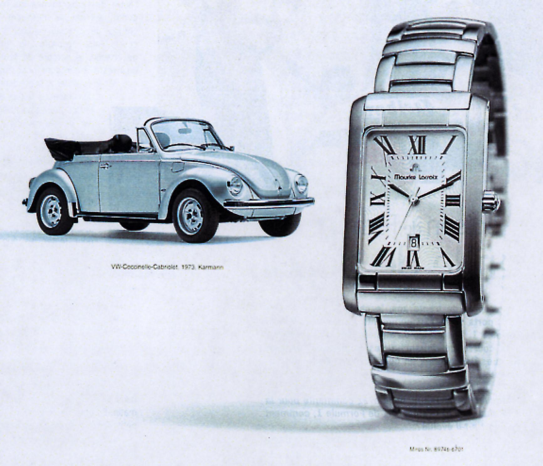 L'image de la Coccinelle est porteuse. Cela les publicistes l'ont bien compris. Ainsi, on ne compte plus le nombre de publicités faisant appel à la Coccinelle. Pour preuve, voici, ci-contre, la publicité réalisée par Maurice Lacroix. Pour présenter leur montre-bracelet, les responsables du marketing n'ont pas hésité à mettre en parallèle une superbe Coccinelle cabriolet. La publicité annonce VW-Coccinelle-Cabriolet, 1973, Karmann. Cependant, si l'on observe attentivement la voiture, on remarque que ce cabriolet est un modèle 1975 ou ultérieur (fabriqué à partir du 1er août 1974).