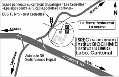 Le souper de fin d'année aura lieu le samedi 6 décembre prochain. Il aura pour cadre le restaurant de l'ISREC (Institut de biochimie, laboratoire cantonal) à Epalinges. A la sortie de l'autoroute à Vennes, prendre la direction d'Epalinges. Aux feux d'Epalinges, juste après la sortie de l'autoroute, prendre à droite (2x) en suivant les panneaux ISREC. La ferme restaurant "La Source" se trouve en haut des bâtiments abritant les différents laboratoires (voir plan ci-dessous). Apéritif dès 19h30, souper à partir de 20h30. Vous avez le choix entre les deux menus suivants :