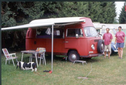 C'est donc pour ce dernier meeting de l'année que se sont rassemblés les habitués du club, ou en tout cas en partie. Pour les absents, vous avez eu tort, il a fait comme d'habitude grand soleil. Nous avons pu faire nos dernières grillades en commun, bien que Barthez (alias Stefan Balmori) avait oublié le charbon. Heureusement que les grills jetables existent, sinon Raphaël n'aurait pas pu griller ses steaks. Eh oui, pour une fois qu'il prenait de quoi pique-niquer!) Comme d'habitude, nous avons été très bien accueillis et avons eu droit à la traditionnelle bouteille de vin. Pour couronner le tout, notre ami Pelou a eu le prix de la meilleure transformation. Merci le Vee Dub Valais pour cette manifestation. |