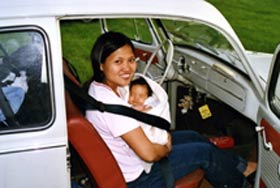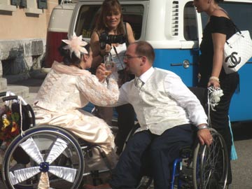 au volant ne passent plus inaperçus. Dans notre civilisation, malgré une prise de conscience ces dernières années, rien n'est fait pour les personnes handicapées. Ceux qui ont la chance de pouvoir se déplacer librement ne se rendent pas compte de tous les problèmes rencontrés par les personnes en fauteuil roulant. Face à cette situation, si certains handicapés ont tendance à "baisser les bras", d'autres au contraire ne s'en laissent pas compter et font tout pour avoir une vie "normale" et vivre à fond leur passion. C'est le cas d'Alain et de sa charmante épouse Véronica. Ce n'est pas parce qu'ils sont "cloués" sur une chaise roulante à longueur de journée qu'ils restent les bras croisés. On ne peut être qu'admiratif face à cet état d'esprit. Ceux qui ont eu la chance d'assister à leur mariage garderont de ce 24 juin un souvenir lumineux et surtout plein d'émotion. Aux dernières nouvelles, un heureux événement est même déjà annoncé pour le début de l'année prochaine! Alain et Véronica, le Lémania Coccinelle Club est fier de vous avoir comme membres. Au nom de celui-ci je vous adresse mes meilleurs voeux de bonheur dans votre nouvelle vie de couple et très bientôt de... famille. Olivier