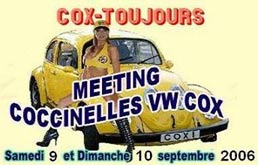 Les 9 et 10 septembre prochain, le "Club Cox Toujours" organise son 14e meeting au Cap d'Agde qui se situe à une centaine de kilomètres de Montpellier en direction de l'Espagne. Ce meeting, dont la cote ne cesse de monter, a attiré l'année dernière plus de 500 voitures. Pour 35 euros, vous avez, outre un programme démentiel (on a pas une minute de répit!), un soleil quasi assuré et le charme du bord de mer, le camping du vendredi et samedi, l'apéritif et le repas du samedi midi, l'apéritif, le repas et la soirée concert dansante du samedi soir, le petit déjeuner du dimanche matin, la dégustation d'huîtres, de vin blanc et le repas du dimanche midi. Qui dit mieux ! Plusieurs membres du club se sont déjà annoncés pour participer à ce week-end de folie. Seulement ils rejoindront le lieu des hostilités après leur semaine de vacances. Si vous désirez les rejoindre sur place, n'hésitez pas. Pour plus de renseignements, vous pouvez contacter Alex Diserens au 079/203.03.83. |
