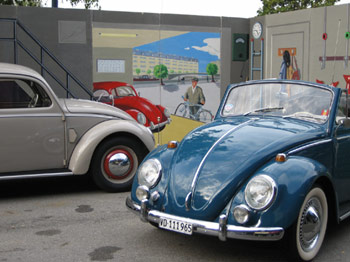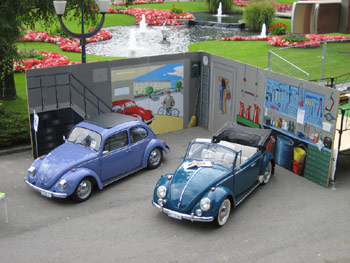 avec 2 tables, une Coccinelle rouge cabriolet, un panneau illustrant