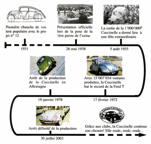 Comme vous le savez, la Coccinelle a connu une carrière extraordinaire. Sa longévité est même unique dans l'Histoire de l'Automobile. Depuis sa présentation officielle en 1938 la Coccinelle a largement eu le temps de séduire son public. Et ce n'est pas parce que les chaînes de production se sont définitivement arrêtées en 2003 que son aura va diminuer. Bien au contraire! Tant qu'il y aura des clubs comme le Lémania Coccinelle Club à travers le monde, la Coccinelle va continuer à arpenter les routes du monde entier apportant du bonheur sur son passage!